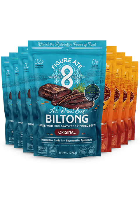 Figure Ate is committed to delivering premium, regenerative products that you can trust. Our biltong is made from grass-fed and finished beef, sourced from ranches practicing regenerative agriculture that improves soil health and biodiversity. We use an artisanal air-drying process with no artificial preservatives, nitrates, or added sugars—just pure, wholesome protein. Every product is from regenerative ranches, ensuring the highest standards of quality and environmental stewardship.